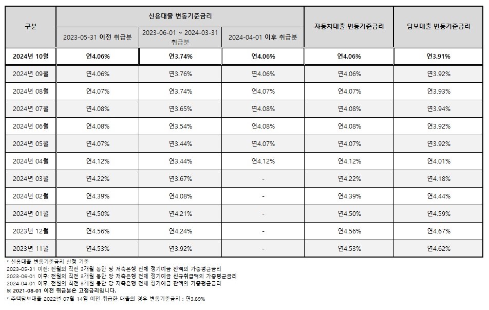 2024년 10월 변동 기준 금리 공시 안내