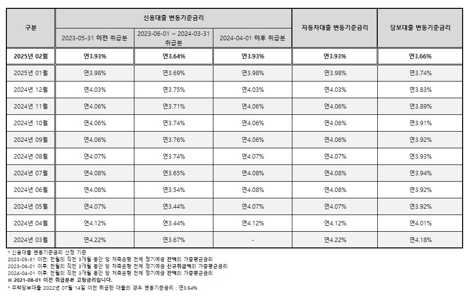 2025년 03월 변동 기준 금리 공시 안내