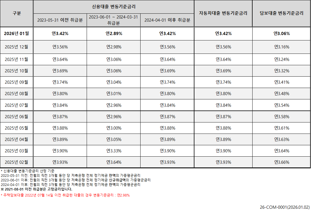 2026년 02월 변동 기준 금리 공시 안내